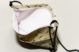 A pochette with small pattern on the light yellow cloth. It's easy to coordinate with clothes.
